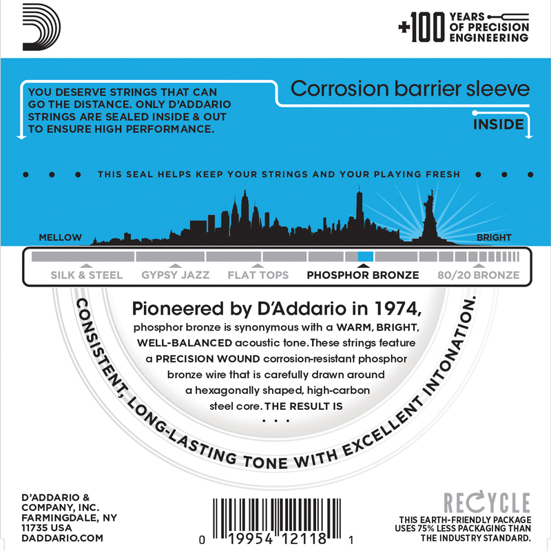Фосфорная бронза была представлена для производства струн компанией D'Addario в 1974 году и с тех пор стала синонимом теплого, яркого и хорошо сбалансированного акустического звучания. Струны серии Phosphor Bronze компании D'Addario изготовлены из антикоррозийной фосфорной бронзы, точно обмотанной вокруг шестиугольного сердечника из высокоуглеродистой стали. Результатом является длительное , яркое звучание с богатыми интонациями.