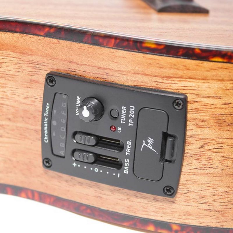 Гавайская гитра TOM TUC-200E оборудована качественным темброблоком TP-20U, так что Вы в любой момент можете подключить ее к усилителю! Настройте звучание при помощи ручек Bass, Treble, Volume и все готово к выступлению на сцене. Кроме того, темброблок имеет встроенный хроматический тюнер для быстрой настройки инструмента.